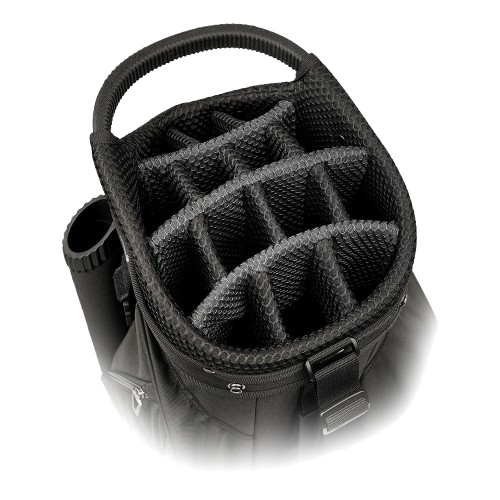 • Featured pockets include a strategically placed sunglass and cell phone pocket, a velour-lined waterproof valuables pocket, and a thermal-lined cooler pocket large enough to get you through a whole round. A hidden pocket on the bottom conceals a full-sized rain cover for those harsh weathe